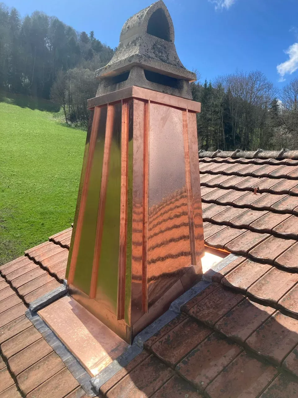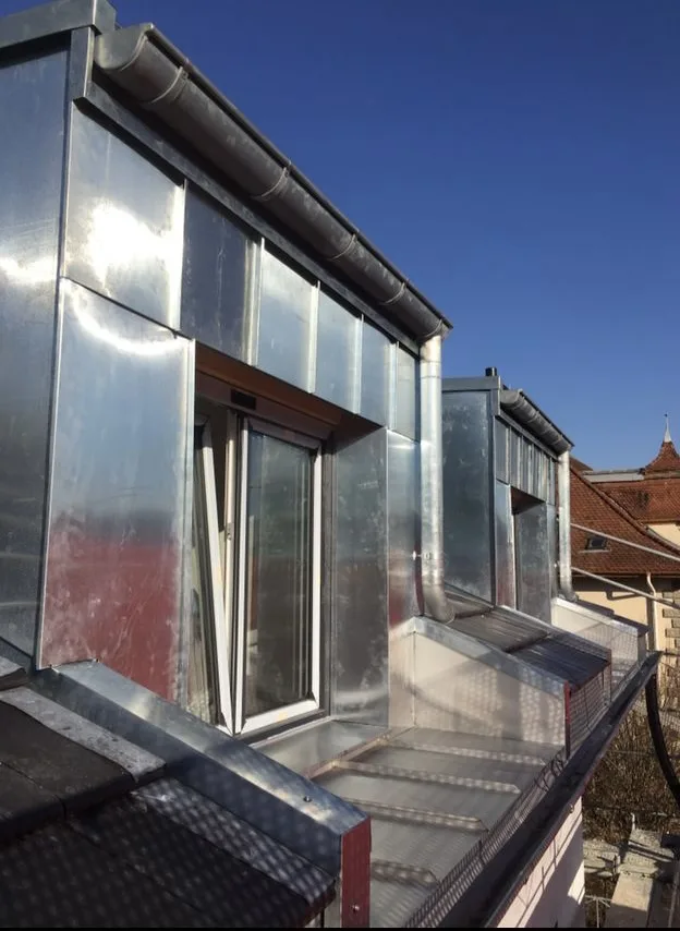 - Ferblanterie – Habillage de toitures et façades, chéneaux, descentes d’eau, couvertines, entourages de fenêtres, réparations.